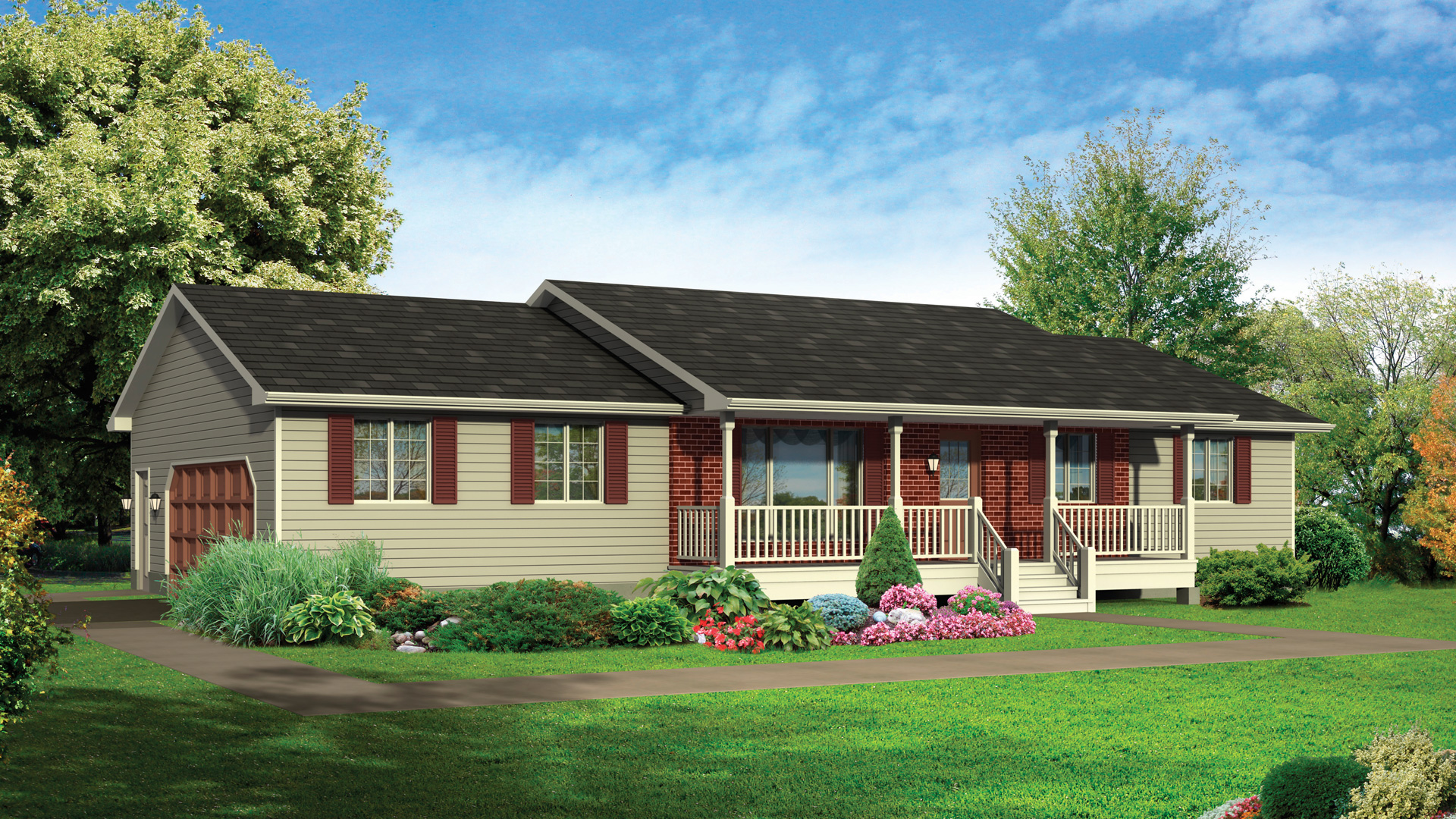 The Kingsford home offset roof gives a contemporary architectural look and a beautiful, covered front porch to this dynamic three-bedroom home. The large living room window fills the spacious, open-concept interior with light. The well-appointed kitchen features a convenient work island and extensive cabinetry, including a microwave shelf and a pantry. If you like, add the optional 4-piece ensuite, a fireplace or other features from our wide range of available options.